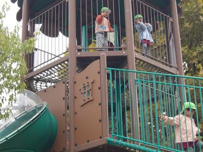 今日は、3歳児にとって初めての園外保育。みんなでバスに乗って町内(美松台)の「ぐるぐる公園」まで出かけました。