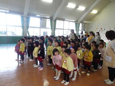 今日は令和6年度の修了式を行いました。遊戯室に集まったのは3歳児と4歳児の子どもたち。5歳児が卒園したので人数が少なくなり、少し寂しい感じがしましたが、元気一杯に園歌を歌ってくれました。みんなで一年の活動や頑張りを振り返り、成長を喜び合った後、春休み期間中に守ってほしい3つの「あ」について話をしました。①「あ」あいさつ ②「あ」あんぜん ③「あ」あとしまつです。約束を守って、安全で楽しい春休み期間を過ごしてくれることを願っています。保護者の皆様、一年間、大変お世話になり、ありがとうございました。
