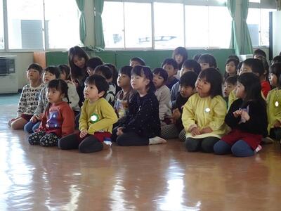 今年は2月2日が節分。今日はこども園で「節分遊びの会」を行いました。遊戯室で園長先生の話に続き、先生たちが節分にまつわるお話をペープサートで紹介。だれにでもある弱い心を追い出そうと呼びかけました。その後、それぞれの保育室で豆に見立てた丸めた新聞紙を「鬼は外、福は内」と言いながら投げました。今年もみんな健康で幸せな一年が過ごせますように。