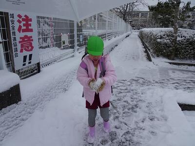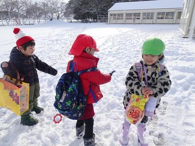 登園後の身辺処理を済ますと、次々に園庭に出てきて思い思いの雪遊びを楽しむ姿が見られていました。