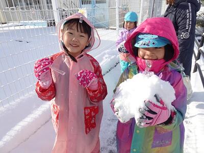登園時から子どもたちはとってもうれしそうに、「雪でいっぱい遊べる」と笑顔いっぱい。