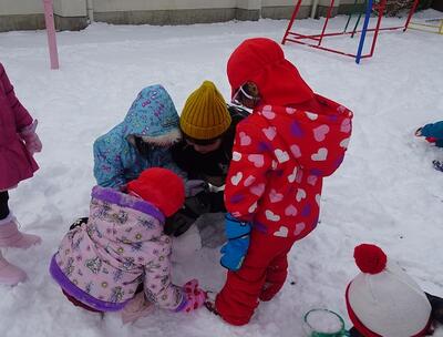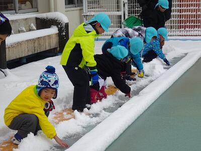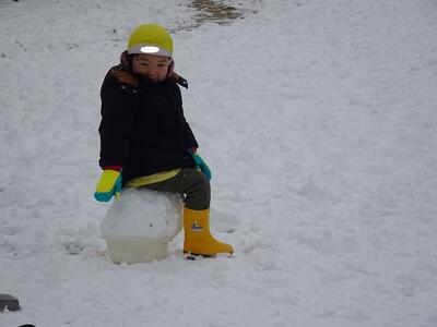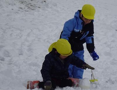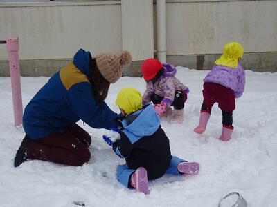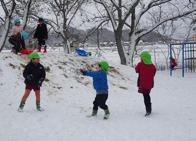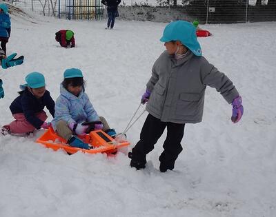 築山でのそり遊びや雪だるま作り、雪合戦やごちそう作りなど、先生や友達と思う存分雪遊びを楽しみました。つららや氷も見つけて、冬ならではの自然の面白さや不思議さも感じながら過ごすことができました。