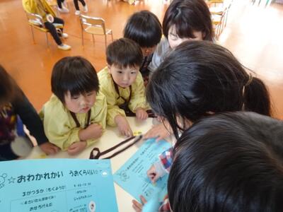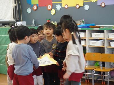 4歳児を中心に「大きい組さんにありがとうの気持ちを伝えたい」「最後に一緒に楽しく遊びたい」と準備を進めてきました。