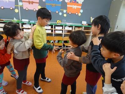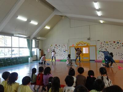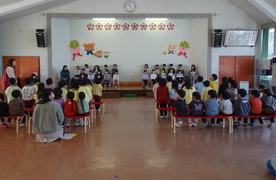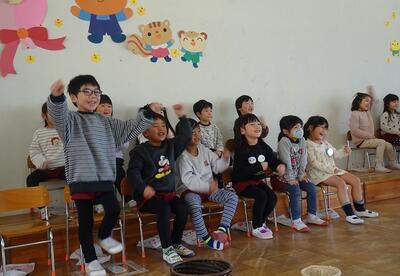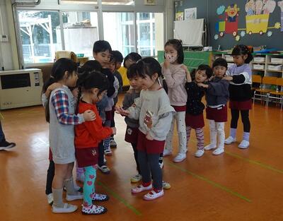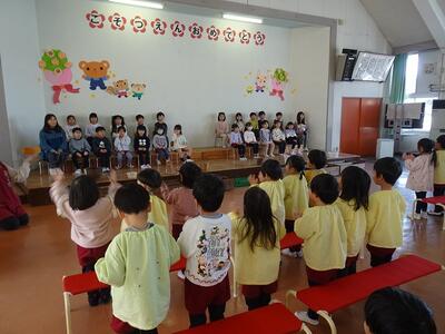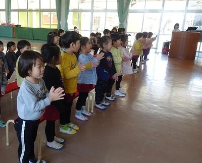 今日が、遊戯室に全員そろうのは最後になりました。楽しい思い出とともに、ありがとうの気持ちを伝え、5歳児の門出をお祝いできた一日となりました。