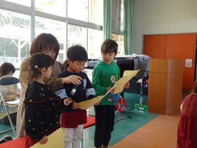 今日は、一年間様々なところで園活動にご協力・ご支援いただいた地域・関係機関・保護者の皆さまに子どもたちから感謝の気持ちをお伝えする「ありがとうの会」を実施しました。