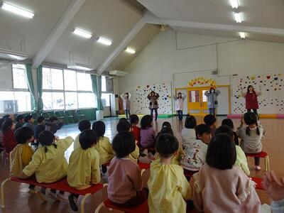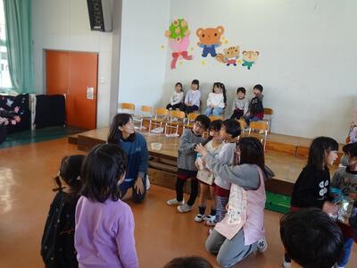 「おはながわらった」の手遊び歌や、「せんろはつづく まだつづく」の絵本、「ひなのやまかご」「しゃぼん玉とばせ」のパネルシアターを見せていただきました。