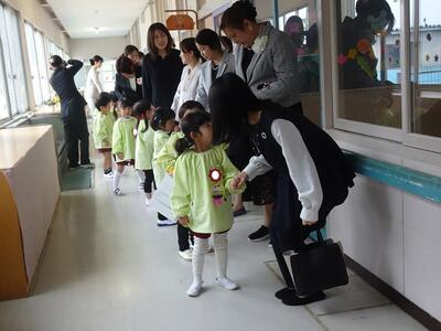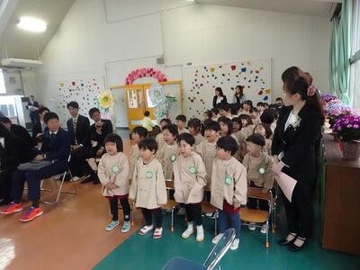 1年間で、心も体も大きく成長した3・4歳児の子どもたちが遊戯室に集まりました。たくさんの経験を積み重ねながら成長してきた子どもたちの表情は、とても清々しくうれしそうでした。