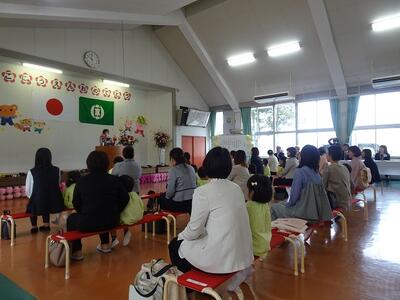 入園式では、担任の先生に名前を呼んでもらうと元気な声で「はい」と返事ができました。4・5歳児の子どもたちは、小さいお友だちを迎えることを楽しみにしていましたので、元気に歓迎の歌を歌ってお祝いすることができました。