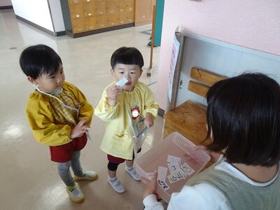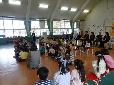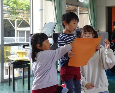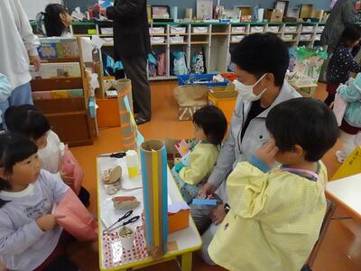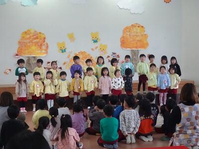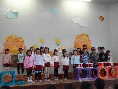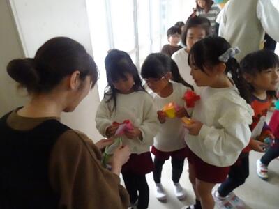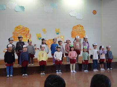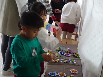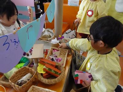 5歳児のお店屋さんに出かけたり、先生のお店屋さんで素敵な折り紙の作品を買ったり、みんなで遊戯室に集まって各学年の歌の発表を聴いたり、先生の出し物で「どうぞのいす」の劇を観たりして楽しく過ごしました。