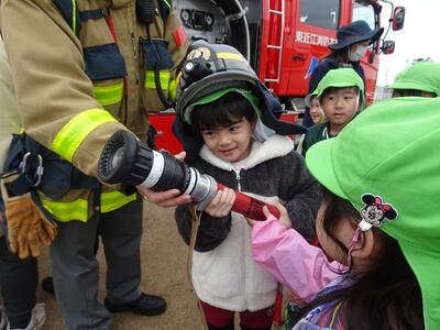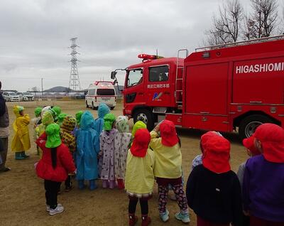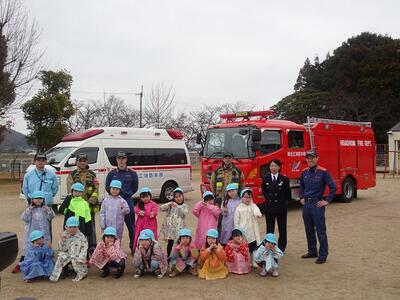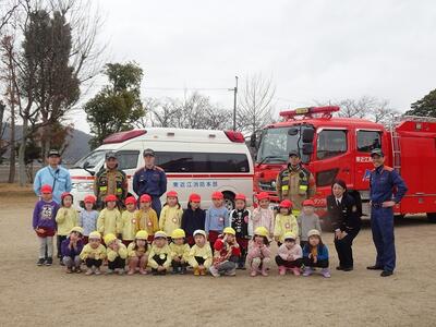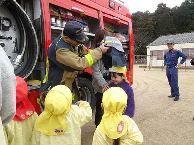 その後は、園庭に出て消防車と救急車の見学をさせていただきました。消防車や救急車の中の様子も見せていただき興味津々の子どもたちでした。
