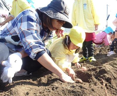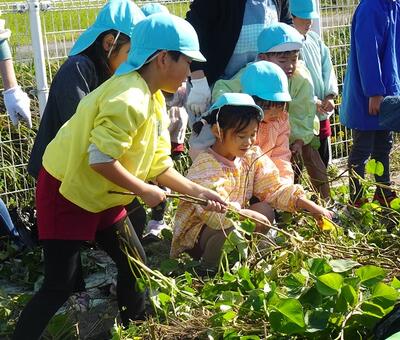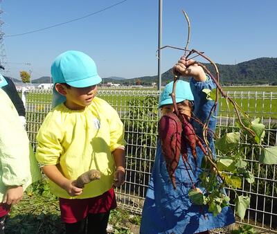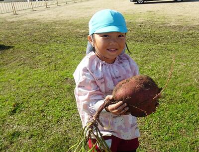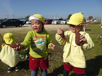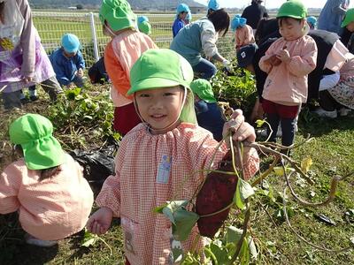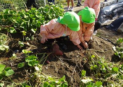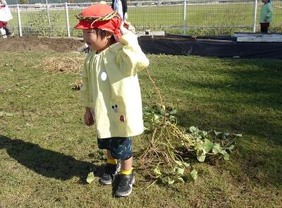 ツルを引っ張ったり土を掘ったりしながら、おいもを見つけるたびに「やったー!おいも見つけた」「こんなに大きいのが掘れたよ」「小さいのもあった」などなど、子どもたちは大喜び。