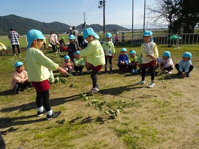 子どもたちは「運動会で転んでもケガしないように」「きれいになった園庭、うれしいな」と、シルバー人材センターの皆さんとのかかわりも楽しみながら取り組みました。
