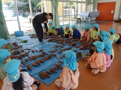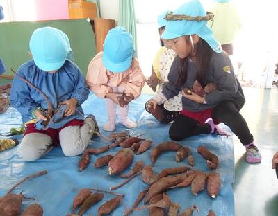 5歳児が掘ったおいもの数を数えると、大小合わせて328個。「みんなで焼いも食べられるね」「どんなおやつができる?」と楽しみにする様子も見られました。