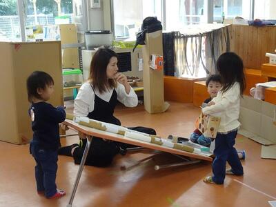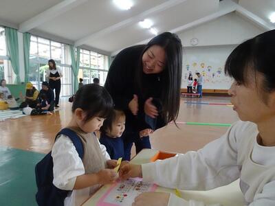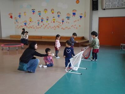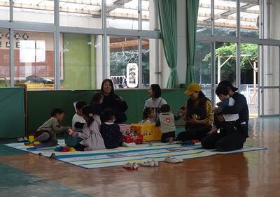 遊戯室で4歳児と一緒に遊んだり園庭で砂場や遊具で遊んだりウサギに餌をあげたりしながら、楽しい時間を過ごしていただけたのではないでしょうか。