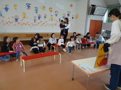 みんなで集まっての絵本タイムも、お家の方と一緒に楽しく参加できていました。