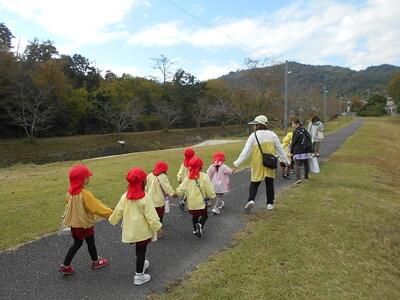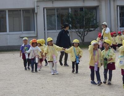 竜王西小学校付近でバスを降り、4・5歳児が手をつなぎ、目的地までは仲よく元気に歩いていくことができました。