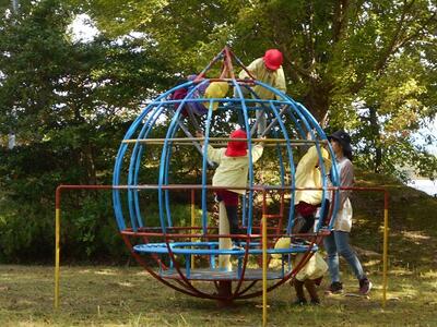 今日は、3歳児にとって初めての園外保育。みんなでバスに乗って町内(美松台)の「ぐるぐる公園」まで出かけました。