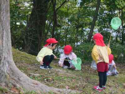 公園では、遊具で遊んだり、どんぐりを拾ったり虫つかみをしたりしながら、心地よい気候の中で自然を感じながら楽しい時間を過ごしました。