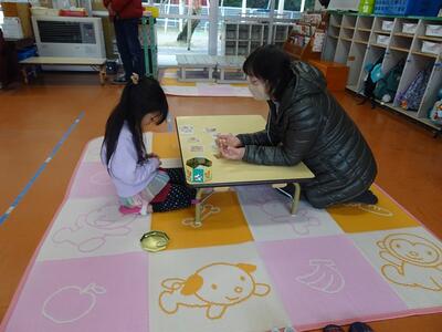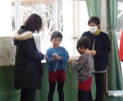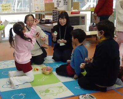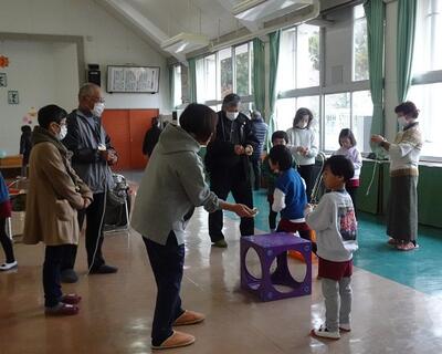 みんながそろって朝の会をした後は、早速おじいちゃん・おばあちゃんと一緒にお正月遊びを楽しみました。