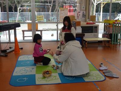 カルタやおてだま、こま回し、けん玉、たこあげ、風船を使った羽子板など、保育室や遊戯室、園庭で楽しそうな声がたくさん聞こえてきました。
