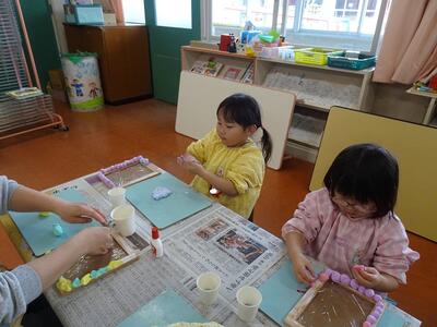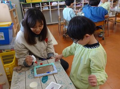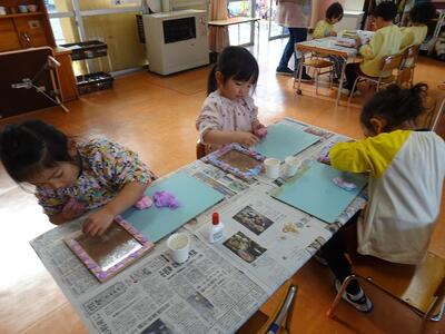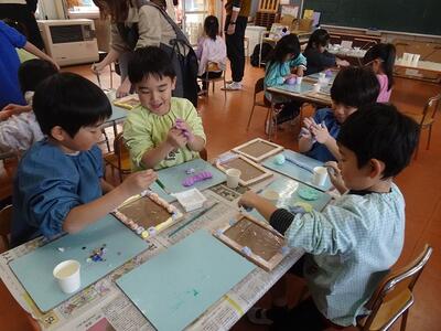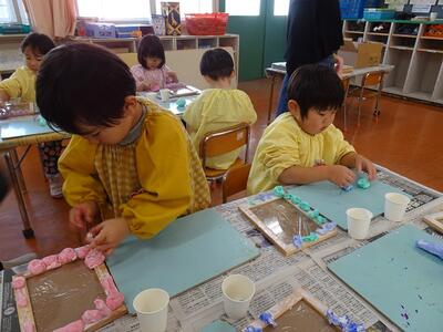 木製の写真フレームに色とりどりの紙粘土やビーズを飾り付けて、一人ひとりの個性が感じられる、すてきな写真立てを作りました。
