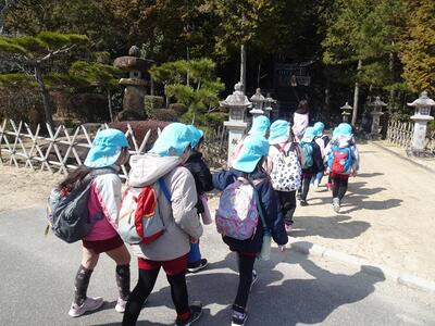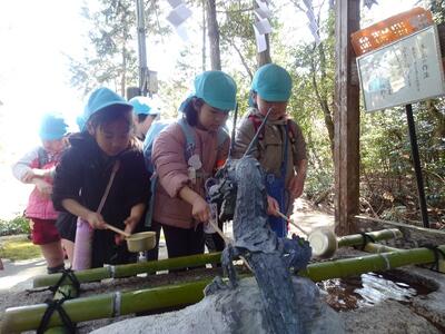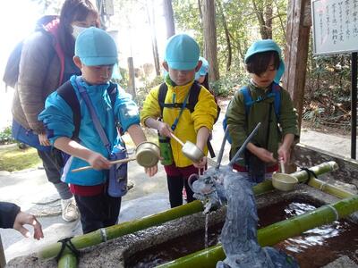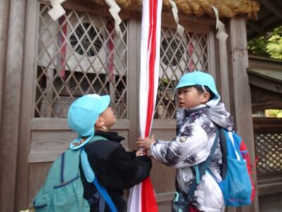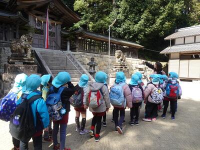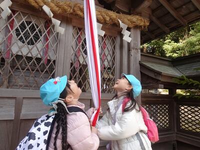 七里地区では「石部神社」にお参りしました。前に出かけた神社でお参りの仕方を教えてもらっている子どもたちは、こちらでも上手にお参りし、「元気な1年生になれますように」とお願いをしました。