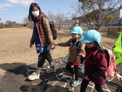 希望が丘の公園でスクールバスを降り、「ここが〇〇ちゃんと◎◎ちゃんの住んでるところだね」「広い公園があるんだね。楽しそう・・・」「この道から小学校に行くの?」などと楽しい会話をしながら、遠足に出発しました。