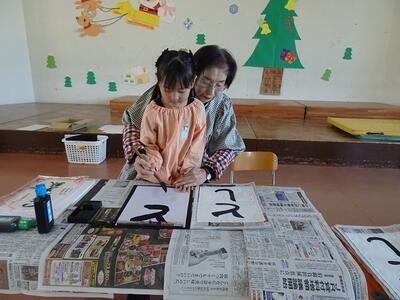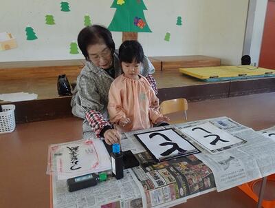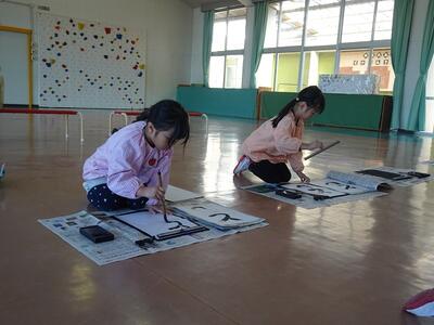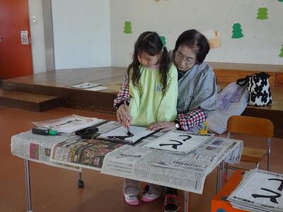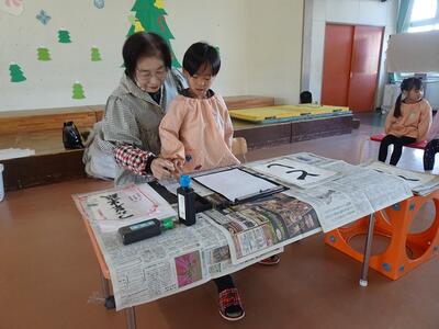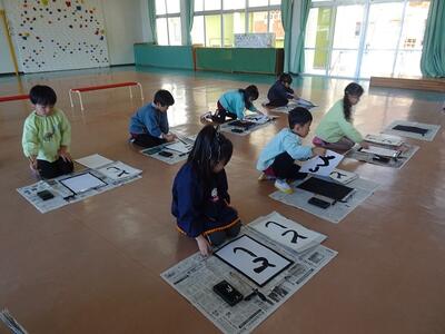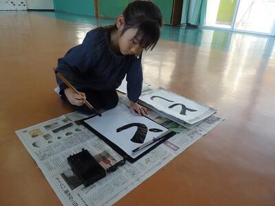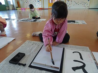 初めて毛筆をもつ子どもも多かったのですが、先生に優しく丁寧に教えていただきながら取り組みました。