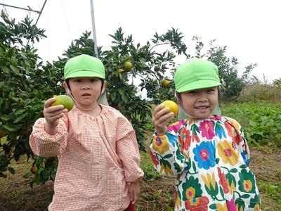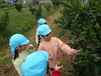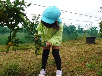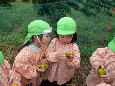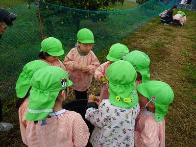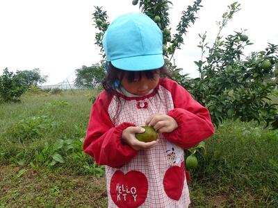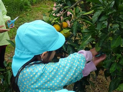 みかんがりでは、清水果樹園の清水さんからみかんの品種を教えていただいたり、夏の暑さで少し日焼けしてしまったみかんでもおいしくいただけることや、青いみかんは酸味があってさわやかな味、黄色いみかんの方が甘い・・などなどいろいろと教えていただいた後、たくさんのみかんの中から「これ!」と思ったみかんをハサミで切ってみんなでおいしくいただきました。すっぱかったり甘かったり、様々な味を楽しみながら子どもたちは大満足でした。