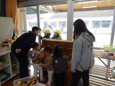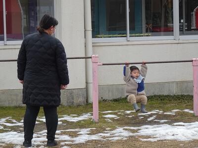 園庭で遊ぶ3歳児の様子に気づき、寒い中でもお外に出て遊ぶお子さんもいました。