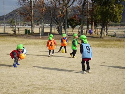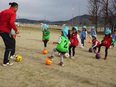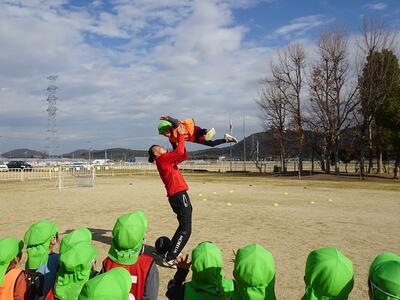 5歳児にとっては最後のサッカー教室です。繰り返し経験しボールと仲良しになった子どもたちは、ボールを使ったいろいろな動きも上手になって、得意そうに見せてくれる様子もたくさん見られました。