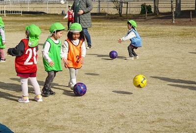 4歳児もサッカー教室が楽しみな活動になってきて、コーチの話をしっかりと聴きながら元気いっぱい取り組んでいました。まだまだ慣れないこともあるので少しドキドキする様子もありましたが、一生懸命ボールを追いかけて笑顔もたくさん見られていました。