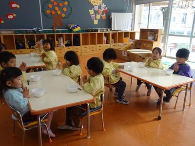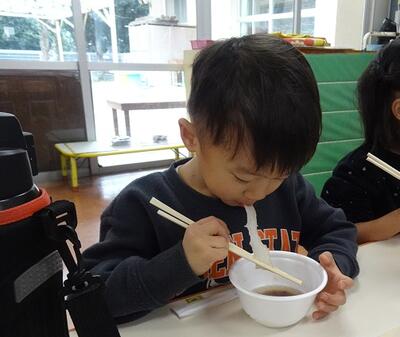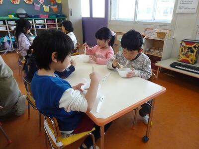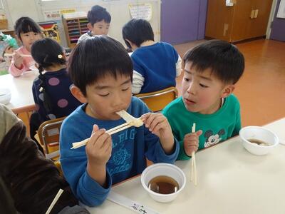 もちつきとぜんざいにしていただいた「もち米」は、12月に地域の方が「こども園のもちつきに使ってね」と譲ってくださったものです。たくさんいただいたので、もちつきだけでなく、ぜんざいにしていただくことができました。地域の皆さまの温かいご支援のおかげで、豊かな経験ができていることを感謝しながらおいしくいただきました。