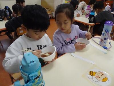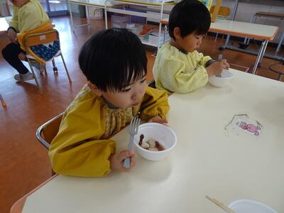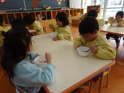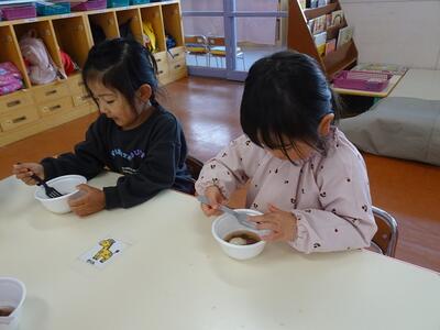 昨年12月にみんなでもちつきをして、「きなこもち」と「しょうゆもち」をいただきました。「おもち、おいしかった」「もっと食べたかったな」という声もあり、今日は「ぜんざい」にしていただきました。