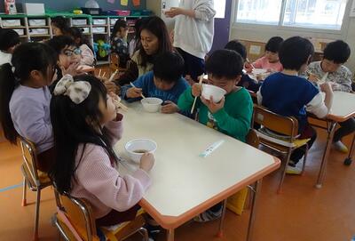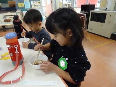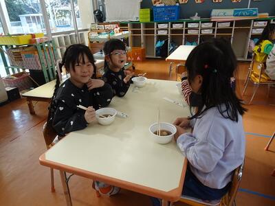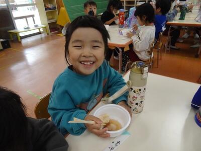 朝から機械でついたお餅と小豆から炊いたぜんざいで、できたてのぜんざいをいただいた子どもたちは「甘くておいしい」「初めて食べた」「お家で作ってもらったことあるよ」と口々に話しながら、みんなぺろりといただきました。