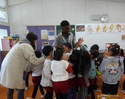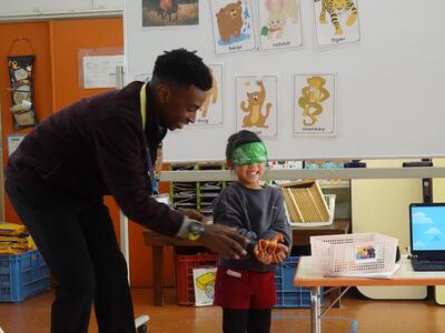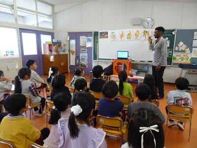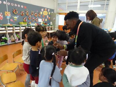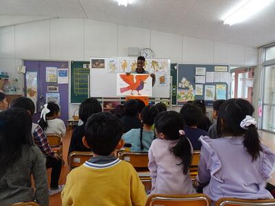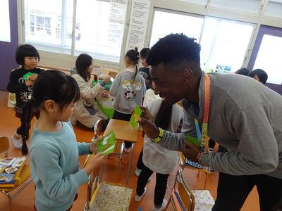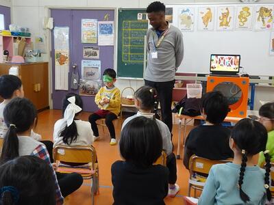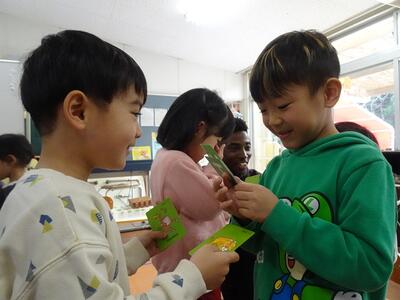 動物の名前や鳴き声を英語で話したり、目隠しをして動物のあてっこしたり、カードを使ったゲームなど、年齢に合わせた内容で楽しく英語に触れることができました。大きな声で英語で答えたり体を動かして楽しんだりし、子どもたちの笑顔がいっぱい、あっという間のひと時でした。