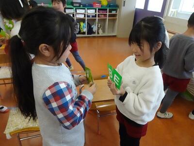 みんながそろって朝の会をした後は、早速おじいちゃん・おばあちゃんと一緒にお正月遊びを楽しみました。