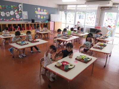 今日から3歳児の給食が始まりました。今日の献立は「ごはん、牛乳、肉団子の和風あん、かつお和え、わかめとふの味噌汁」です。配膳の間、子どもたちがきちんと座って行儀よく待っている姿を見て感心しました。準備ができてみんなで「いただきます。」給食をちょっぴり心配していた子も、みんなで一緒に食べると頑張れます。苦手なものも少しずつ食べられるようになってほしいと思います。