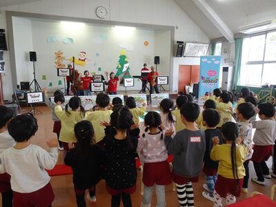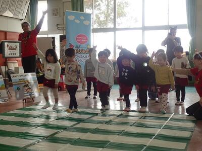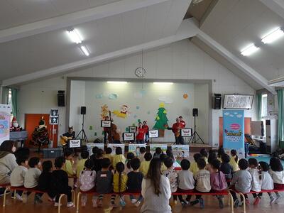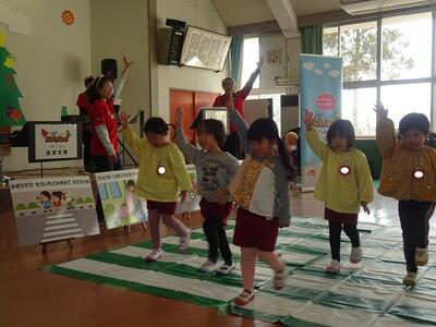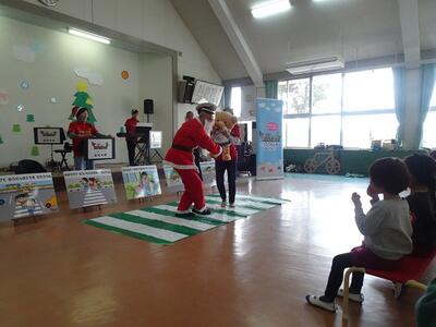 楽しい歌や音楽を聞かせていただいたり、体を使って遊んだりしながら、楽しく交通安全の大切な約束を教えていただきました。