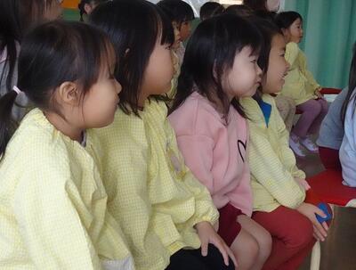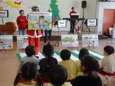 道路の渡り方やチャイルドシートの座り方、自転車に乗る時の約束など、どれも子どもたちが安全に生活するために大切なことばかりです。最後までしっかりと聴くことができていました。