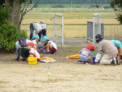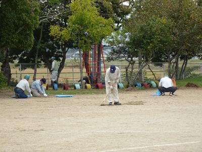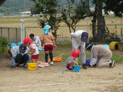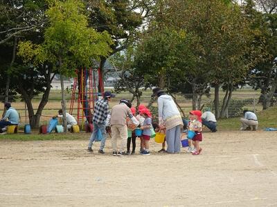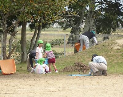 子どもたちは「運動会で転んでもケガしないように」「きれいになった園庭、うれしいな」と、シルバー人材センターの皆さんとのかかわりも楽しみながら取り組みました。